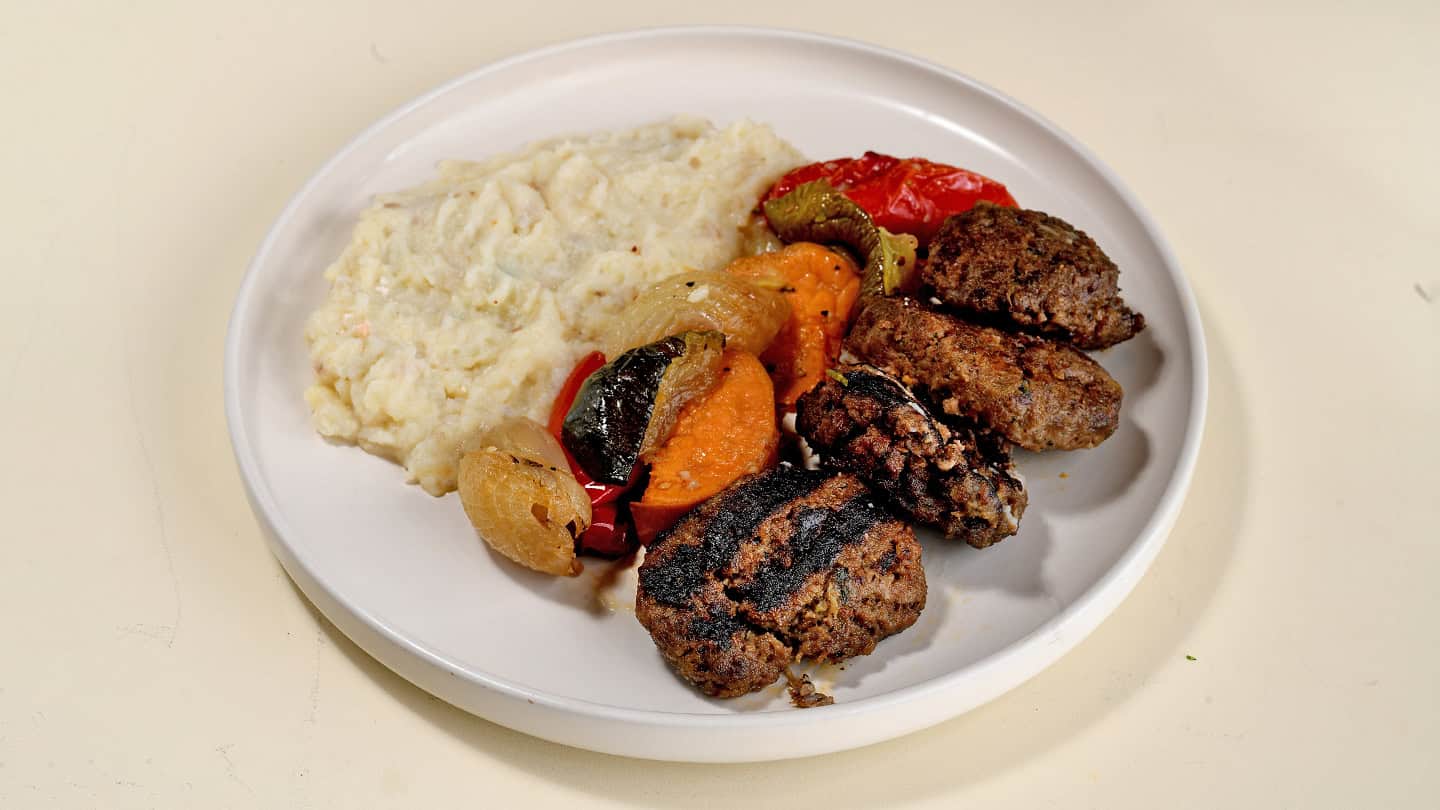 צלחת עם פירה, קציצות בשר בגריל וירקות צלויים.