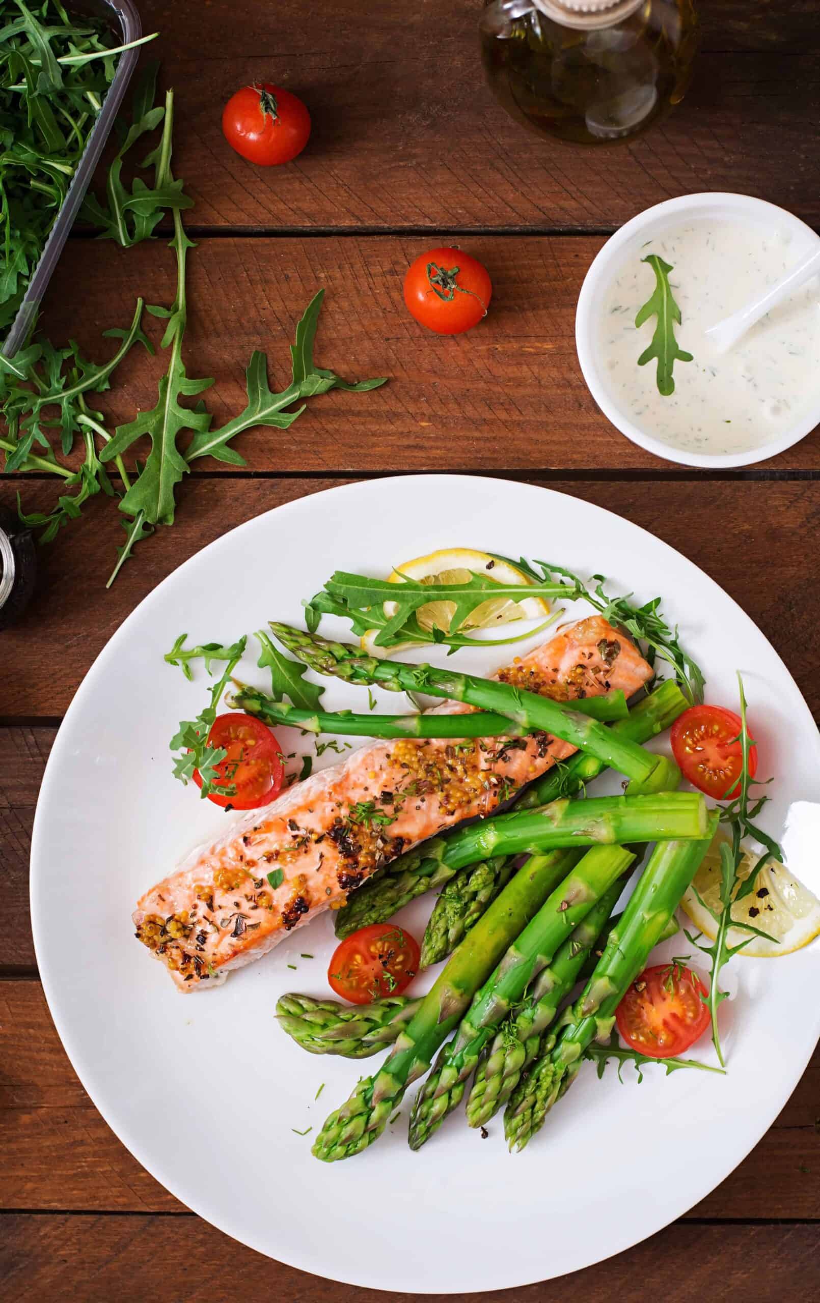 סלמון בגריל עם אספרגוס, ארוגולה, עגבניות שרי ופרוסות לימון על צלחת לבנה.