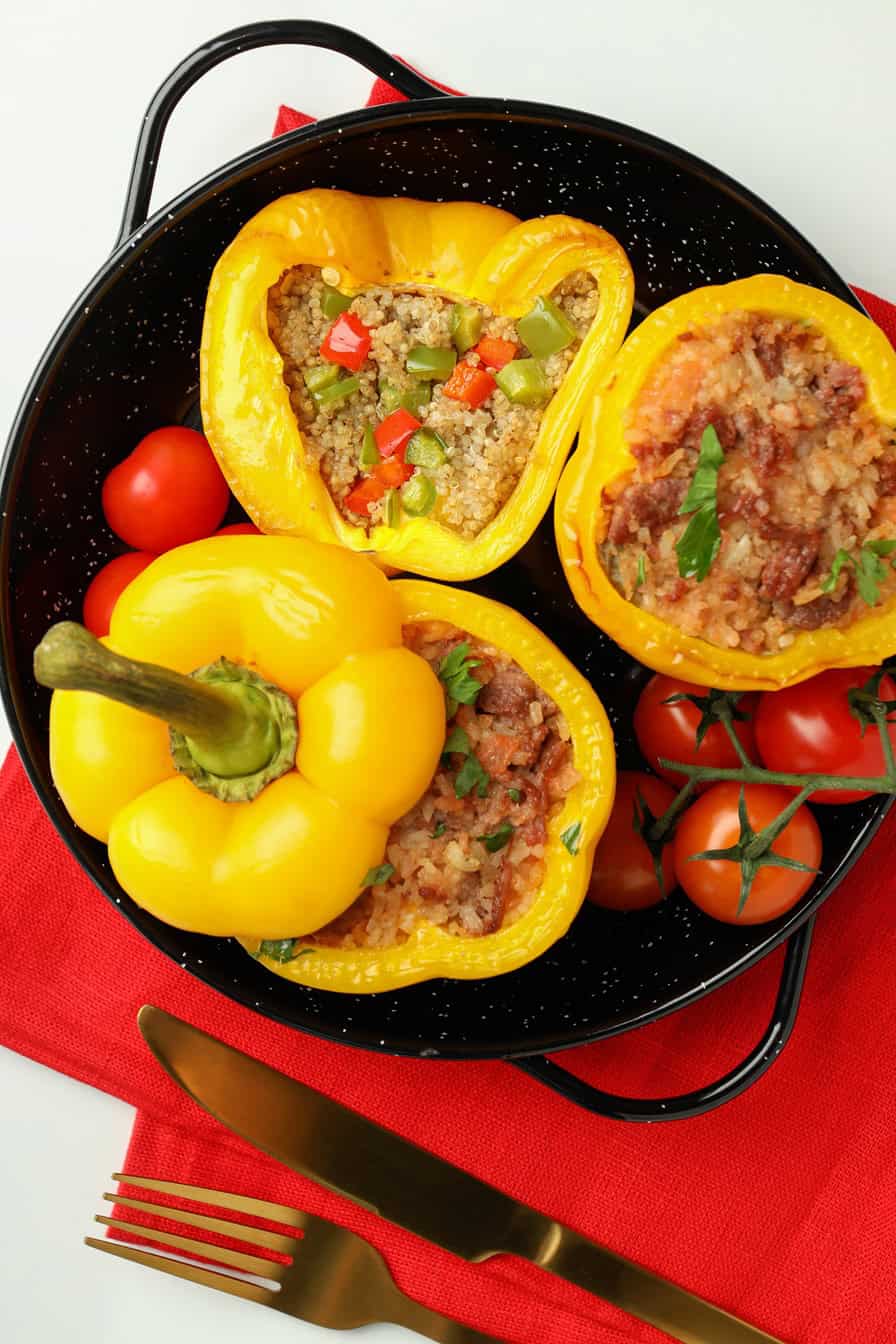 פלפלים צהובים ממולאים באורז וירקות על צלחת שחורה עם עגבניות שרי וסכו"ם.